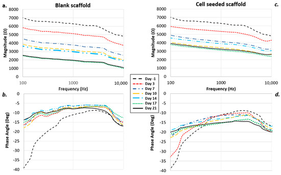 30]. A sinusoidal voltage with frequency linearly sweeping from 100 Hz to 10 kHz was applied to samples through the printed parallel carbon electrodes, and the current response was measured in that frequency range. In order to correlate changes in the measured impedance with the adhesion and growth of cells within the scaffold, we performed impedance measurements before and after cell seeding. All the pre-seeding tests were carried out using the very same type and quantity of medium that was used for cell culture, after leaving the scaffold in immersion for 1 h to allow the material to swell and to come in contact with the parallel electrodes, due to its volumetric expansion. The same measurements were repeated for all the sensors in order to obtain for each of them a reference value to be compared with the corresponding after-seeding measurement and also to assess the variability among the different scaffold/sensors systems.