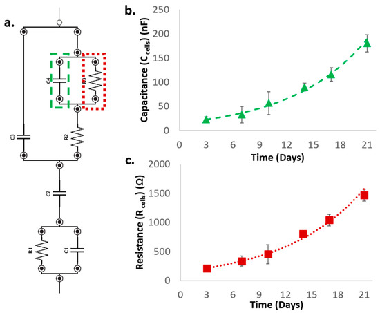 Cell contribution to the overall acquired impedance spectra was extracted by fitting magnitude and phase angle spectra with an electronic equivalent circuit model; this approach was used to describe sensor-scaffold-cells system, adapting to the presented set up the models adopted in recent literature to model scaffold-based 3D cell cultures [