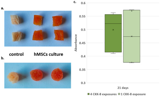 To monitor hMSC proliferation during 3D culture, we used the Cell Counting Kit-8 colorimetric assay (CKK-8—Sigma-Aldrich, Merck Life Science S.r.l., 20149 Milano, Italy) based on the dehydrogenase activity detection in viable cells. Preliminary experiments with 2D culture in 96-well plates (2000 cells/cm2) were performed to test hMSCs’ response to CKK-8. In detail, 4-times treated hMSCs showed an average absorbance value of 15 ± 5% lower than cells at first-time treatment. Flow-cytometry counts confirmed a lower cell average (18 ± 5%) in cultures after 4-times treatments. Difference could be partially explained by the greater number of washes related to the 4 treatments, and however, it is in any case comparable to the variability range (16 ± 5%) observed between replicates with the same number of CKK-8 treatments (data not shown).