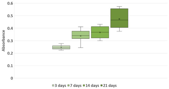 On the days of the enzymatic test (days 3, 7, 14), the 96-well culture plates were replaced with new sterile plates to prevent the risk of contamination and get rid of any cellular debris adhered to the wells. In addition, the complete culture medium was completely replaced. To ensure correct humidity inside the plate, 12 peripheral wells were each filled with 200 μL of sterile water, restored if necessary.