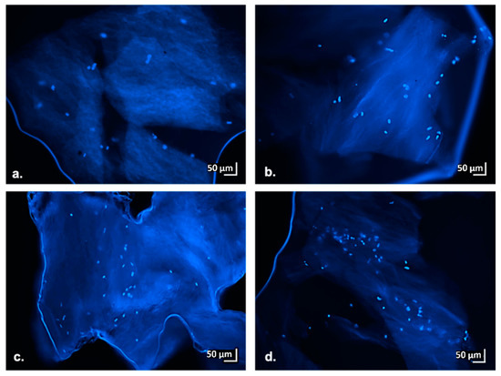 Cell presence and distribution in the scaffold was visualized at 3, 7, 10, 14 and 21 days of culture by sacrificing the scaffolds and analyzing the thin slices with an inverted fluorescence microscope (Olympus IX70, OLYMPUS, 20034 Hamburg, Germany). The cell nuclei were stained with DAPI (4′,6-diamidino-2-phenylindole—Resnova). Thin slices were photographed at a magnification of 10×.