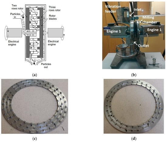 (a) Schematic depiction of the investigated disintegrator; (b) laboratory DESI 11 HSG mill (c) rotor with three rows of pins; (d) rotor with two rows of pins.