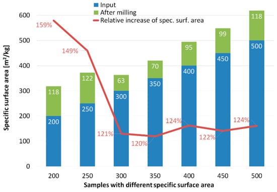 The resulting specific surface areas for all the seven ground samples, together with the absolute and relative values of their increases, are depicted in Figure 3. The results show that the absolute specific surface area values increased significantly when grinding coarse fractions (specific surface areas of 200 and 250 m2/kg). In contrast, both the absolute and relative specific surface area values were lower for the input fractions of 300 and 350 m2/kg. The absolute increase in the specific surface area then increases gradually with continuing refinement of the input material, whereas the relative increase in the specific surface area remains more or less constant from the 300 m2/kg input fraction.