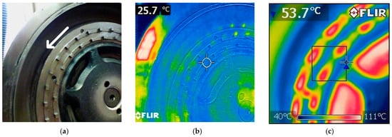Thermal imprints on rotors before and after milling of 1 kg of individual batches: (a) new rotor with two rows of pins (rotation direction is marked by white arrow); (b) new rotor; (c) 200 m2/kg; (d) 250 m2/kg; (e) 300 m2/kg; (f) 350 m2/kg; (g) 400 m2/kg; (h) 450 m2/kg; (i) 500 m2/kg.