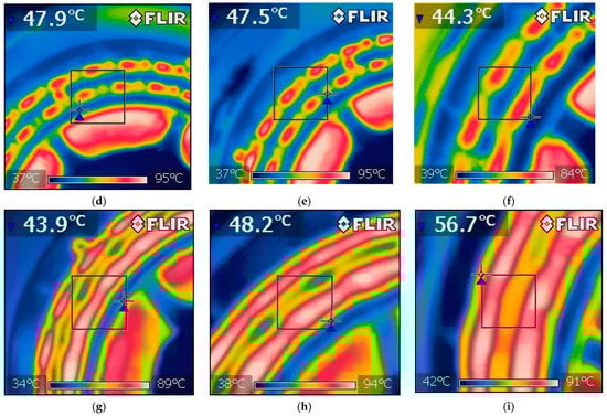 Thermal imprints on the rotors before and after milling of 1 kg batches of 200 m2/kg to 500 m2/kg samples are shown in Figure 4a–i, respectively. The imprints clearly show that grinding of the coarse batches (200 and 250 m2/kg) was primarily performed by the front faces of the rotor pins, the temperature of which increased (Figure 4c,d, respectively). As the specific surface area of the input cement increased, the areas in the vicinity of the pins started to exhibit increased temperature, too. The 300, 350, and 400 m2/kg batches contained plenty of coarse particles, the grinding of which was performed directly on the rotor pins. However, mutual grinding of fine particles against each other in the spaces between the pins occurred as well. This phenomenon was then dominant for the batches with the specific surface areas of 450, and 500 m2/kg, during the milling of which the pins acted more like breaking wedges directing the milled material into the spaces between them. For these fine batches, the particles were primarily milled by their mutual collisions, and milling by direct impacts with the pins’ front faces was of low significance (Figure 4h,i clearly show the pins to be cooler than the surrounding area).