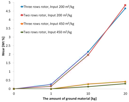 The impact of input granulometry on wear of the grinding rotors is demonstrated by Figure 5 showing wear of the rotors (expressed as loss of rotor mass in relation to the original rotor mass) is dependent on the amount of the ground material. The figure indicates that a coarser material damages the grinding rotors of the disintegrator more significantly than a finer one.