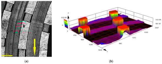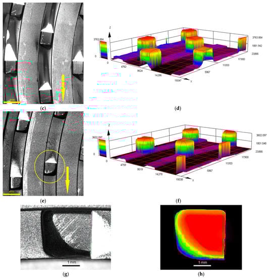 Figure 6a–h show 3D optical microscopy images of the new and worn rotor pins. All the scans were performed on the rotors with three rows of pins. Figure 6a,b depict the 3D scan and height profile, respectively, of the pins of a new rotor, while Figure 6c,d depict the 3D scan and height profile, respectively, of the pins of the rotor used for milling of a 20 kg batch of the 450 m2/kg sample. Figure 6e,f then depict the 3D scan and height profile, respectively, of the pins of the rotor used for the milling of a 20 kg batch of the 200 m2/kg sample. The figures confirm the wear analyses, as they clearly show that the wear was the most significant for the rotor used for milling of the 200 m2/kg batch; scans of a pin from the most worn rotor and its coloured height profile are shown in Figure 6g,h. The figures also show that the wear of the pins was the most significant at their front faces, and also at the face on the side from which the cement particles were injected into the disintegrator. The figures also show evident “shade” behind the pins, which corresponds to the above described occurring milling mechanisms for the individual sample batches.
