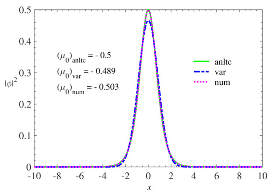 Comparison of variational and numerical results with the analytical solution of Equation (16) for and . The analytical solution, represented by the continuous curve (green), is given by the expression . The variational solution, represented by the dashed curve (blue), was obtained using the Gaussian ansatz whose width, w, obtained by Equation (14) was . The numerical solution, represented by the dotted curve (magenta), was obtained through the propagation of imaginary time using the Gaussian function as an initial condition. Here, labels “anltc”, “var”, and “num” represent analytical, variational, and numerical results, respectively.