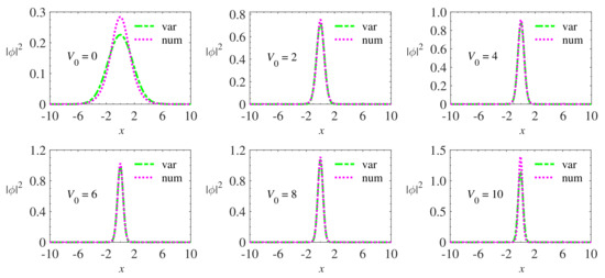 Variational and numerical results of the Equation (16) for different values of the Pöschl–Teller potential amplitude. It is noticed that, as the depth of the potential increases, the wave function width decreases and its amplitude increases, preserving the normalization. The nonlinearity coefficient remained fixed () in all simulations.