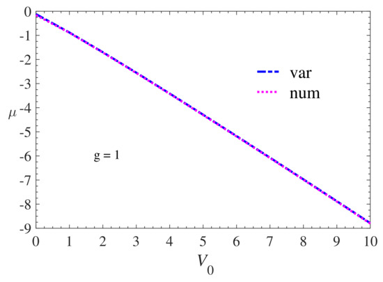 The results for the values of the chemical potentials obtained by varying the amplitude of the potential can be interpreted through Figure 3. The values adopted for the amplitude are within the range . We can see that, as the depth of the potential increases, the chemical potential decreases through linear behavior. In this adopted interval, the results obtained from the chemical potential versus amplitude showed similar results observed in studies of Bose–Einstein condensates and Superfluid Fermi gases in optical lattices and optical superlattices (doubly periodic and quasiperiodic) [41,42,43,44,45].