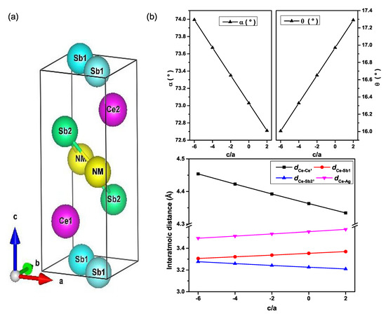 In order to understand the effect of the pressure on the magnetic properties of CeNMSb, we carried out first-principles calculations with different magnetization orientations, one with the magnetization along the <001> direction and the other along the <100> direction, due to the lack of information about the magnetic easy axis of the new magnetic phases above in both compounds. The total energies () were computed by varying the volume and ratio of the unit cell. An analysis and overview of the volume and ratio of the unit cell variation process effects on the crystallography environment are presented in Figure 1. The Sb-Ce-Sb bond angle , (second-nearest neighbor), and were linearly decreasing. The tilt angle of the Ce-Sb bond with respect to the ab-plane, as well as and were found to increase linearly with increasing the ratio. Here, stands for the distance between Atom A and Atom B. One must note that there were two crystallographically different Sb atoms as presented in Figure 1. The crystallography data reported here revealed the sensitivity of the Ce atoms’ relative position to the pressure resulting from varying the ratio through the 2D optimization. Consequently, we argued that a subtle difference in the relative position of Ce atom led to different occupations of Ce 4f-orbitals, resulting in different magnetic easy axes, as presented in the rest of this paper.