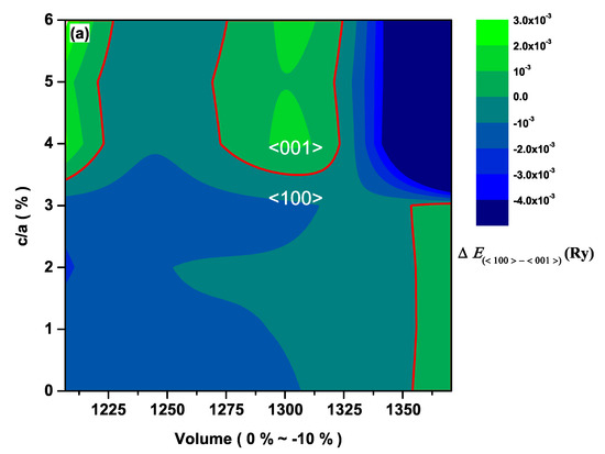 The contour plot of the total energy difference, between the cases with the magnetization along the <001> and <100> directions for CeAuSb and CeAgSb, are displayed in Figure 2 and Figure 3, respectively. If , the <001> direction is the easy axis, and the <100> direction is the easy axis otherwise. We have to keep in mind that the energy differences between the cases for and in such a class of compounds are in order of mRy. As shown in both Figure 2 and Figure 3, it is obvious that there were some regions where , implying that the <100> direction could be the easy axis when an appropriate pressure is applied. Hence, it was unambiguous that the pressure could cause a rotation of the easy axis.