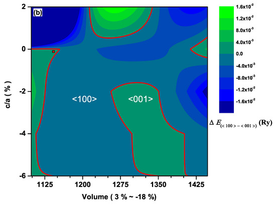 We speculated that the variation of the relative positions of Ce atoms played an important role in the different orbital occupation, this different orbital occupation resulting in different , and consequently, the change in the relative position of Ce atoms produced the rotation of the magnetic easy axis. To verify this speculation, we examined SOC matrices for 4f-orbitals through the volume and ratio of the unit cell variations by following the same reasoning as in our previous work on AFM CeNMSb compounds [25,26]. Since we knew that the sign of was a key reference to judge the magnetization easy axis and the matrix elements gave null results [25], we simply considered and calculated along <001> where the negative sign of must be obtained if the <001> direction was the easy axis. As shown in Figure 6, it was evident that there were some regions corresponding to where , implying that the energy gain of CeAuSb due to the SOC was negative. That led to the state with magnetization along the <001> direction being energetically higher than that with magnetization along the <100> direction. The opposite scenario would be true when the <100> direction was the easy axis. Further, there was no need to repeat the same calculation for the CeAgSb compound [26], since the only difference between the present and the previous calculations was the number of k-points. Rather, we picked one point above , as indicated as the red square symbol in Figure 3 and calculated . According to the calculation, was −2.7858 . This implied that the magnetic easy axis was along the <001> direction. Therefore, different relative positions of Ce atoms, equivalently different occupations of 4f-orbitals of Ce in these compounds, led to the different orientations of the magnetic easy axes.
