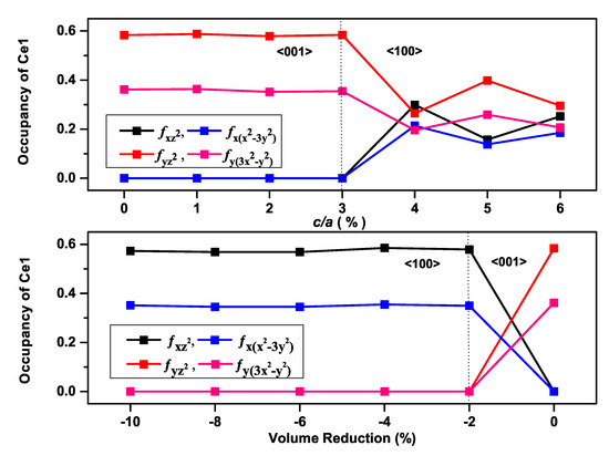 According to our previous findings on AFM CeNMSb (NM: Cu and Au) compounds [25,26], the eigenvectors of occupied 4f-orbitals along the easy axis were only those with 2, for CeCuSb, leading to an easy axis on the ab-plane, and those with 1, ±3, for CeAuSb, with an out-of-plane easy axis, which was ascribed to the different relative positions of Ce atoms rather than the difference of the SOC effects of the noble metals. Additionally, for the accurate prediction for the magnetization easy axis of AFM CeNMSb compounds, it was required to include both SOC and the on-site Coulomb interaction U of the Ce atom in the spin-polarized calculation for the accurate prediction of the magnetization easy axis [25]. Furthermore, uniform density-of-state (DOS) plots were obtained for valence electrons with different magnetization directions. Only Ce 4f-bands displayed an obvious difference. We picked one point as an example to present the partial-DOS (PDOS), which defined the number of electron states per unit energy range on a particular atomic orbital to elucidate the effect of varying the and the unit cell volume on the 4f-orbital occupations for the Ce atom with the magnetization along <001>. It is obvious from Figure 4 that different occupations occurred when the fluctuation took place from the easy axis to the hard axis as the ratio (volume) increased (decreased) for the CeAuSb compound, and this was likewise true for the CeAgSb compound as displayed in Figure 5, which reflected the sensitivity of the Ce atom occupancy to the exerted pressure.