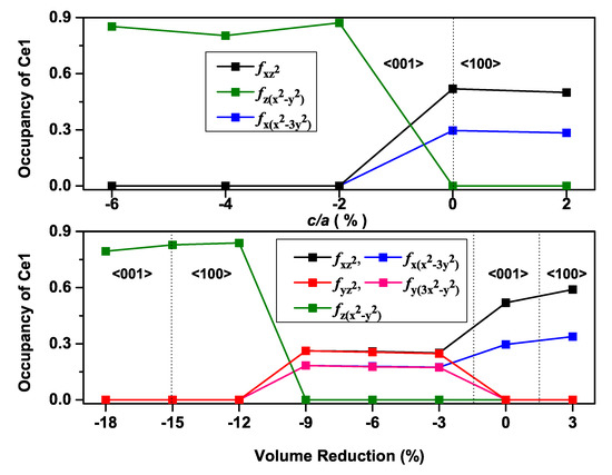 Therefore, on the way to understanding the 4f electrons more systematically under the pressure exerted by varying the volume and ratio of the unit cell, we analyzed the orbital characteristics of occupied Ce 4f bands.