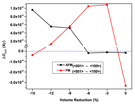In an effort to clarify how the magnetic properties of CeAgSb were affected under applied hydrostatic pressure, considerable experimental investigation was performed [9,20]. Yet, there was a need to verify the response of the magnetic properties of CeAgSb at various pressures. For that purpose, we carried out the detailed investigation of the effects of pressure considering the FM and AFM coupling between the moments of the two Ce atoms. For each configuration, the energy difference between the and states of CeAgSb are presented in Figure 7. If was negative, the <001> direction was the easy axis, and the <100> direction was the easy axis otherwise. As shown in Figure 7, it was obvious that there were some regions where , implying that the AFM state was energetically favorable. If was nearly zero, it meant that paramagnetism was the ground state. Consequently, it was evident that the pressure may result in the rotation of the easy axis, as well as the magnetic phase. Accordingly, we agreed that the appearance of a new magnetic phase of CeAgSb at a pressure of 3.5 GPa was AFM. In our previous study [25,26], we found that the SOC of the Ce 4f electron played a rather important role in the determination of the magnetic easy axis of CeNMSb (NM:Cu, Au and Ag) compounds under ambient pressure. This result was opposite our intuition. It is natural, at first glance, to consider the difference of the SOC of noble metals to be the key factor to determine the magnetic easy axis of these compounds because they crystallize in the same crystallographic structure and are isoelectronic. The only electronic differences were the number of core electrons, which caused different SOC, of noble metals. Not only our previous study, but also the present study indicated that the subtle difference in the relative positions of Ce atoms in different compounds was the key factor to determine the magnetic easy axis. The subtle difference in the relative positions of Ce atoms led to different occupancies of the Ce 4f-orbital, which determined the sign of . Therefore, we could argue that the difference in the relative position of Ce atoms played a more fundamental role in the determination of the magnetic easy axis of these compounds than the difference in noble metals.