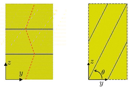 All twin boundaries considered in this work are coherent. The angle represents the angle between the twin plane and the plane of the simulation cell as shown. As well, is the angle between twin plane normal and the loading direction z in what follows. In particular, values of 0, 15, 30, 45, 60, 75 and 90° are considered here. With respect to and loading in the z direction (i.e., ), for example corresponds to pure normal loading, to mixed normal-shear loading, and to pure parallel, loading. The initial twin spacing is set to in all the cases. The simulation cell size is adjusted in each case to satisfy full periodicity as well as defect free closure of the twinned regions. For example the cell shown in Figure 1 (right) has a size of Å for twin angle .