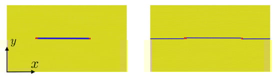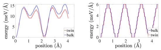 In particular, comparison with the untwinned case is carried out for the twin configuration in Figure 1 (left) in what follows. This simulation cell has dimensions of and contains 756,000 atoms. The x and y directions are parallel to and ( and ), respectively, in the untwinned (twinned) regions, and z is parallel to the twin boundary normal .