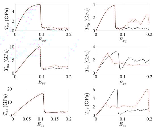 Stress-strain response of the simulation cell in Figure 1 (right) for values of , , , , , , subject to loading. Again, all other stress components are zero.