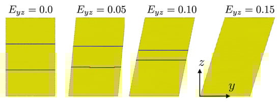 Initially, partial dislocation motion on the twin boundary results in twin boundary motion (from to ). However, as the load increases, deformation of the simulation cell results in a change in the angle between the loading direction and the twin boundary orientation up to around , at which point bulk dislocations nucleate and begin to glide. More specifically, as the system elongates in the z axis during loading, the twin boundaries rotate toward the z axis (see Figure 11), resulting in an effective increase of and a shift from interface to bulk dislocation nucleation and glide as the effective shear stress on the twin boundaries decreases. As shown in Figure 11, bulk dislocations nucleated in form of partial dislocations with extended stacking faults. They glide and interact with the twin boundaries, resulting in bulk slip-twin interaction and bulk slip transfer across the twin boundaries. Based on the simulation results, the very first bulk dislocation is nucleated at and an effective of about 68°.