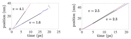 As just discussed, nucleation and glide of partial dislocations on the twin boundary result in “fast” twin boundary motion. To investigate this further, the simulation set-up described in Section 2.3 is employed to determine the velocity of partial dislocations on the twin boundary. For comparison, this is also done for the same partial dislocations in the bulk. Figure 8 displays corresponding results based on the set-ups in Figure 2.