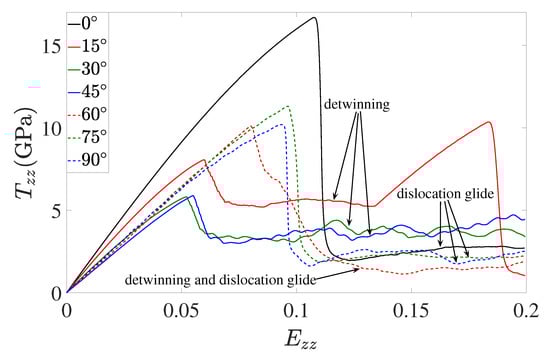 3.1. Untwinned and Twinned Stress-Strain Behavior for Different Loading Cases