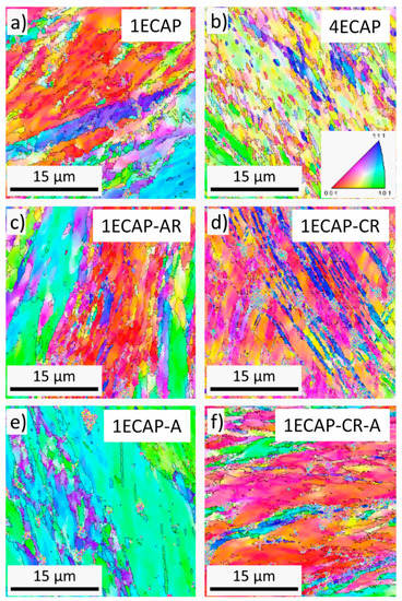 Electron backscatter diffraction (EBSD) grain orientation maps for samples 1ECAP (a), 4ECAP (b), 1ECAP–AR (c), 1ECAP–CR (d), 1ECAP–A (e) and 1ECAP–CR–A (f). The color code for the different orientations is shown in (b). The boundaries with misorientations higher than 2° are indicated by black lines.
