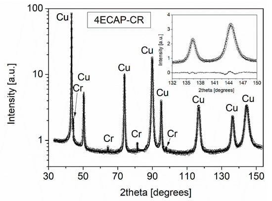 The crystallite size (or diffraction domain size) and dislocation density were determined by XLPA. As an example, Figure 2 shows a CMWP fitting on the diffraction pattern taken for the sample 4ECAP–CR.