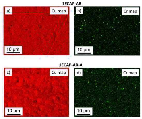 As an example, the elemental maps of Cu and Cr obtained by SEM-EDS investigations can be seen in Figure 3 for the 1ECAP–AR and 1ECAP–AR–A samples.