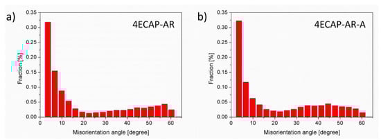 The grain boundary misorientation distributions were determined from the EBSD images. A comparison of the misorientation distributions is shown in Figure 4 for the samples 4ECAP–AR and 4ECAP–AR–A.