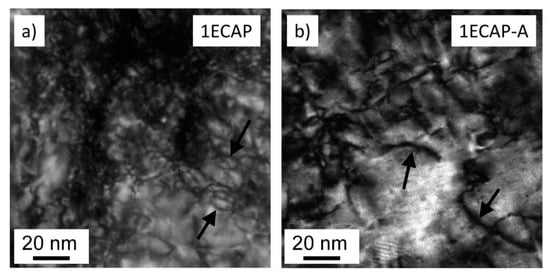 TEM bright-field images taken for the samples 1ECAP (a) and 1ECAP–A (b). Some dislocations are indicated by black arrows.
