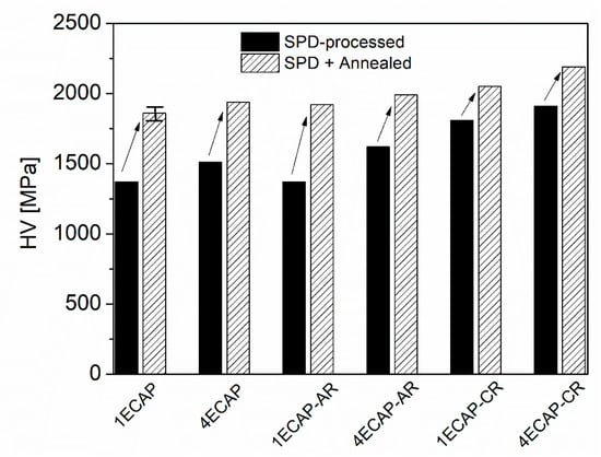 The Vickers hardness (HV) values for the samples processed by equal channel angular pressing (ECAP) and subsequent rolling, as well as for the post-annealed specimens. The arrows indicate the increase in the hardness due to the heat treatment. The error is illustrated by the bar at the column related to the sample annealed after one ECAP.