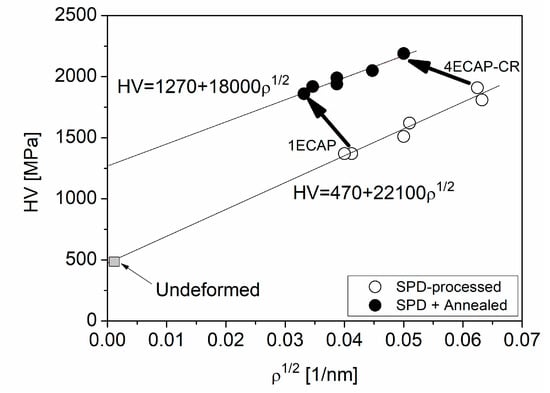 Former studies [42] have shown that heat treatments performed at moderate temperatures (at the homologous temperatures 0.35–0.45 × Tm, where Tm is the melting point) can cause hardening in UFG and nanomaterials. In SPD-processed samples, one possible reason for this anneal hardening is the annihilation of mobile dislocations and/or their clustering, which caused a more difficult initiation of plastic deformation after the heat treatment [42,43,44]. Indeed, in our samples the dislocation density decreased during annealing and, additionally, the dislocation arrangement parameter increased (see Table 2), which suggests significant changes in the dislocation structure. For the analysis of the effect of the dislocations on the hardness, a Taylor plot was constructed in Figure 7 using the following formula: