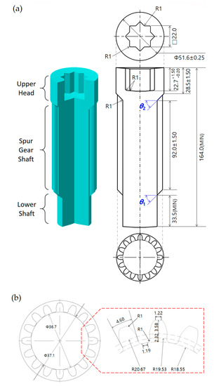 Figure 1a illustrates the three-dimensional configuration and two-dimensional layout of the drive shaft that can satisfy these aforementioned requirements. In Figure 1a, it can be seen that the drive shaft has an internal spline structure with a groove depth of 22.7 mm (in an error range of −0.20 mm to 1.50 mm), an outer height of 28.5 mm ± 1.50 mm, and a spur gear geometry with a tooth projecting length (that is, the face width on the top land) of 92.0 mm ± 1.50 mm along the shaft, as well as an extruded length of 33.5 mm on the lower shaft part. Additionally, Figure 1a shows the detailed feature of the internal spline structure, and Figure 1b depicts the specific profiles of the sixteen-tooth spur gear. Regarding the tooth specifications of the spur gear geometry, the addendum and dedendum depths are 3.58 and 2.32 mm, the face and tooth thicknesses are 1.22 mm and 4.68 mm, and the diameter of the bottom land is 37.10 mm ± 0.25 mm.