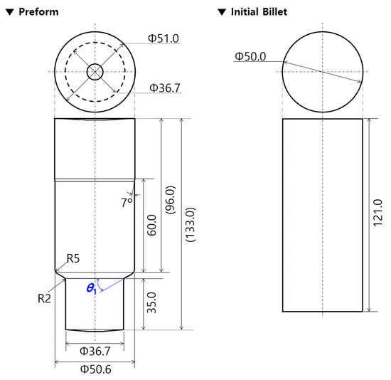 Before designing the preform for obtaining the drive shaft, the geometric feature of the lower shaft shown in Figure 1a was first reviewed. Then, it was observed that the forward operation in the combined extrusion makes it impossible to form a shape other than the teeth profiles, and that the detailed features of the lower shaft and the shoulder angle (θ1) must be induced from the preform. In consideration of these facts, the preform was designed as shown in Figure 2. In this process, the lower shaft of the preform was outlined with a diameter of 36.7 mm and a length of 35.0 mm, while the upper shaft was designed with a diameter of 51.0 mm and a length of about 96.0 mm in order to provide sufficient workpiece volume for the upper head part and the spur gear section, as shown in Figure 1a. Next, the initial workpiece was also designed using the proposed preform. That is, the lower shaft of the preform was regarded to be forward extruded using the initial round workpiece, and the upper shaft was set to be almost the same as the initial billet. The initial round billet was determined to have a diameter of 50.0 mm and a length of 121.0 mm, as shown in Figure 2. Consequently, the cold forging process consisted of the forward extrusion for the intermediate workpiece as the preform using the initial round billet and the combined extrusion for the drive shaft using the forward extruded workpiece. In detail, the initial round workpiece was first compressed until the forward extruded length reached 35.0 mm. Then, this preform was forged until the groove depth of the internal spline region was roughly 22.7 mm and the extruded face width of the spur gear part reached about 92.0 mm, as shown in Figure 1.