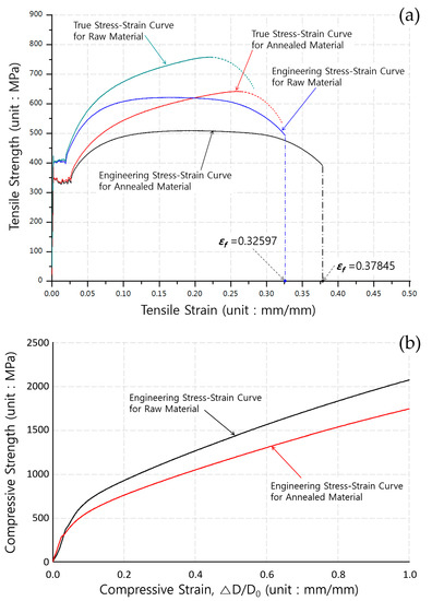 The tensile properties of AISI 1035 carbon steel, which were obtained from the uni-axial tensile tests, are summarized in Table 1. Furthermore, the stress and strain curves obtained from the uni-axial tensile and compression tests are displayed in Figure 3. The engineering and true stress–strain curves extracted from the uni-axial tensile tests are presented in Figure 3a; these indicate that the tensile yield strength decreased by about 60 MPa and that the ultimate stress was reduced by approximately 110 MPa. Moreover, in the true stress–strain modes, the elongation property was improved by a value of broadly 13.76%. Figure 3b illustrates the compressive stress–strain characteristics of the raw and the annealed AISI 1035 carbon steel materials, and these indicate that the compressive strengths of the billet materials before and after the annealing were sufficiently gained. Further, the compressive yield stress and the ultimate strength of the heat-treated specimen were slightly decreased, but the degrees of those compressive strengths are shown to be sufficient.