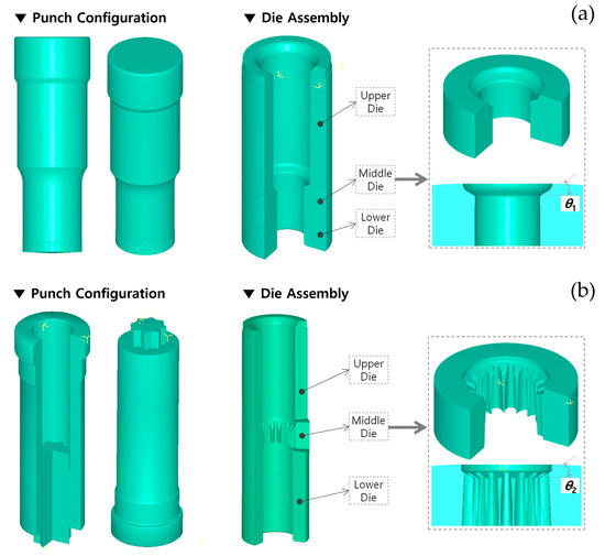 Therefore, the geometric variables of the drive shaft can be identically regarded as the shoulder angles on the extrusion dies (middle), as illustrated in Figure 4. In detail, the shoulder angle (θ1) in Figure 1a was considered to be induced from the preform, so the slope angle was directly applied to that of the forward extrusion die (that is, the shoulder angle on the middle die), as shown in Figure 4a. In addition, the other angle (θ2) in Figure 1a was believed to have resulted from the combined cold extrusion, and this angle was also accepted to that on the middle die for the combined extrusion, as depicted in Figure 4b.