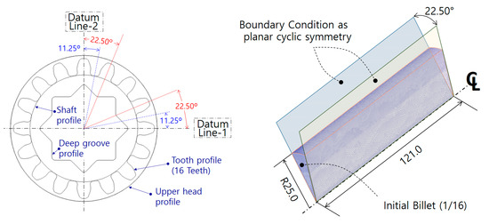 As the cold forging process consisted of the forward and combined extrusion, these separated forging operations were necessarily both individual FEM-based numerical simulation models. In other words, two FE models must be constructed, such as one related to the forward forging process for the preform and the other related to the combined extrusion operation for the drive shaft. Figure 5 shows the superimposed cross-sectional profiles of the lower shaft part and the spur gear section, as well as the internal spline region, which were all positioned at the same central axis. As both the datum lines were orthogonal to each other, the internal spline of the upper head section was presented as having cyclic planar symmetric characteristics with a unit angle of 22.50°, and the sixteen-tooth spur gear part was illustrated to have a structure with a unit angle of 11.25°. These results indicate that the FE models for the upper head and the spur gear parts were successfully constructed, with three-dimensional one-sixteenth (1/16) and one-thirty-second (1/32) structures, respectively. However, because the combined extrusion process should be simultaneously operated, it was revealed that the numerical simulation models are suitable for adopting the three-dimensional one-sixteenth (1/16) FE models derived from the cyclic planar symmetric condition. Thus, the three-dimensional numerical simulation related to the forward extrusion for configuring the preform from the round billet was also proper for application to the one-sixteenth (1/16) structure. Based on these considerations regarding the geometric symmetricity and the boundary condition, each FE model required for the cold forging simulations was set-up according to the minimized one-sixteenth (1/16) cyclic planar symmetric condition in order to reduce the computation duration.