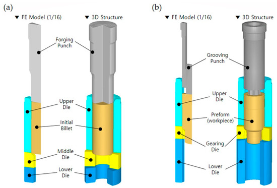 The numerical simulation model for the forward extrusion to realize the preform is displayed in Figure 6a; it consisted of a forging punch, an upper die, a middle die (that is, an extrusion die), a lower die, and an initial billet of AISI 1035 medium carbon steel with a diameter of 50.0 mm and a height of 121.0 mm, as shown in Figure 2. Furthermore, the FE model for the combined extrusion to produce the final target configuration is also illustrated in Figure 6b, and it was composed of a grooving punch, an upper die, a middle die (that is, an extrusion die), a lower die, and a preform. All of the tool components were regarded as rigid bodies without heat effects during the cold working [21]. The initial workpiece for the forward extrusion and the preform as the intermediate workpiece for the combined extrusion were each regarded to have plastic deformation behavior due to the fact that the elastic recovery of the forged workpiece is typically ignored.
