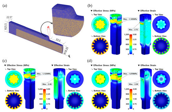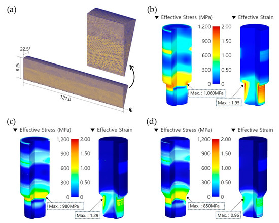 Regarding the results obtained from the forward extrusion simulation with a shoulder angle of 30°, Figure 7b shows the effective stress and strain distributions. A maximum effective stress and strain of about 1060 MPa and 1.95 were predicted at the extruding neck region, and the forward extruded length was satisfied to be roughly 35.00 mm when the punch stroke reached about 27.51 mm. When a slope angle of 45° was applied to the preform, as shown in Figure 7c, the maximum effective stress and the maximum effective strain were found to be approximately 980 MPa and 1.29 around the shoulder part of the preform, and the punch stroke to attain the required forward extrusion length of 35.00 mm was subsequently about 28.73 mm. In addition, Figure 7d depicts the effective stress and strain distributions visualized by the forward extrusion simulation with the shoulder angle of 60°, and the maximum values were observed to be 850 MPa and 0.96. Furthermore, this cold extrusion simulation was completed with a punch stroke of approximately 31.52 mm in order to secure the extrusion length on the lower shaft.