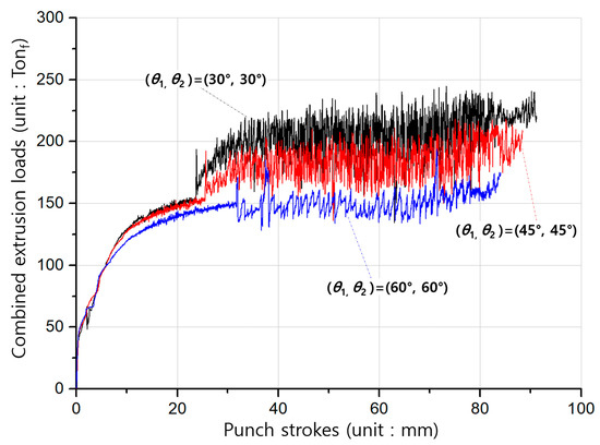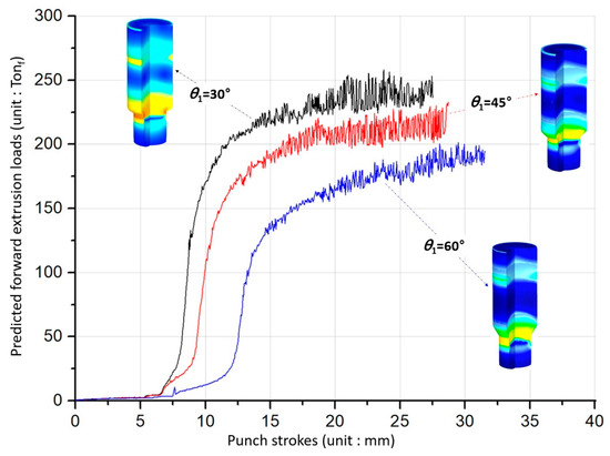 The simulated results with regards to the forward extrusion for obtaining the preform show that the effective stresses and strains were typically distributed, and that the maximum values were similarly positioned around the extruded neck region of the deformed preforms. In particular, it was observed that the effective stress and strain levels, as well as the maximum values, tended to decrease with an increasing shoulder angle. These facts can be clarified by predicting the forward extrusion loads. Figure 8 shows three forging load histories with the shoulder angle (θ1) of the preform being given as 30°, 45°, or 60°. It was then revealed that the cold forging load decreases as the shoulder angle is increased. It suggests that the large shoulder angle leads to a decrease in the cold forging load due to the smoother metal flows around the extrusion die during the forward extrusion operation.