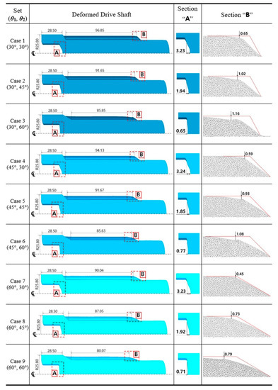 In this study, the parametric investigations with regards to both shoulder angles of θ1 and θ2 on the extrusion (middle) dies were conducted as shown in Figure 7 and Figure 9, respectively; it was observed that the deformed geometries are numerically well-simulated and the effective stress and strain are also appropriately distributed. In the parametric study, the most important point of all was to survey and determine the actually applicable combination set. In order to support this consideration, the geometries of the drive shaft extracted from the FEM-based numerical simulations were compared with the reference dimensions illustrated in Figure 1. Because the drive shaft was required to match the upper head height of about 28.50 mm, this value was set as the reference dimension to easy approach. That is, when the reference value was approximately 28.50 mm, due to the fact that the face width at the top land of the spur gear was set to be roughly 92.00 mm ± 1.50 mm, it was evaluated whether or not the extruded face width was satisfied by the combined extrusion process.