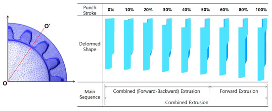 Because the main geometries of the drive shaft were actually realized by the combined extrusion consisting of the forward extrusion and backward extrusion, the deformation history was traced in terms of the operation sequence of both extrusions in the progress of the cold forging process, when the shoulder angle (θ2) of the extrusion die was 45° with the preform obtained by the angle (θ1) of 45°. As shown in Figure 12, a cross-section O-O’ on the bottom land of the spur gear geometry was used to trace the deformation history during the combined extrusion. When the preform was compressed by the deep grooving punch, deformed shapes per increments of every 10% based on a total punch stroke of about 88.28 mm—as predicted in Figure 9c and 10—were visualized. The deformation history of the combined extrusion is shown in Figure 12, and it was verified that the backward extrusion for realizing the deep groove at the internal spline region and the forward extrusion for actualizing the sixteen-tooth spur gear were well synchronized as well as sequentially operated during the combined extrusion. It could be seen that the internal spline structure was already formed and that the sixteen-tooth spur gear was partially shaped by the combined extrusion when the punch stroke reached about 40%. Since then, the sixteen-tooth spur gear was mainly forward extruded. In particular, it was revealed that the sinking phenomenon along the central axis on the internal spline region occurred when this combined extrusion was approaching the end sequence of the cold forging. Consequently, it can be summarized that the combined cold extrusion to manufacture the drive shaft with the distinctive shapes of the deep-grooved internal spline structure and the sixteen-tooth spur gear shape was well composed and meaningfully operated with regard to the process compatibility.