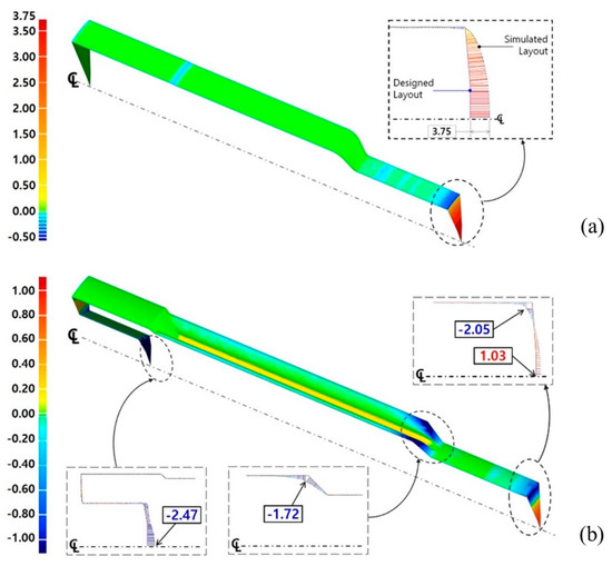 Further, Figure 13b illustrates the result of the comparative evaluation between the numerically predicted feature and the required geometries of the drive shaft. Altogether, the results showed that the dimensional variations were small and consistent with the range of −0.25 mm to 0.25 mm. However, according to the locally distributed error contour illustrated in Figure 13b, the numerically obtained drive shaft, as compared with the designed shape, had a sinking depth of about −2.47 mm in the upper head region, along with an additional protrusion of 1.03 mm around the center part of the lower shaft and a difference of −1.72 mm at the end of the extruded spur gear section. Remarkably, the dimensional error distributions in Figure 13 differed slightly from the numerically predicted values, as the vertical distance illustrates in Figure 11. However, these variations can be attributed to the fact that the image processing software used in this study displays the relative distances between the comparative objects.