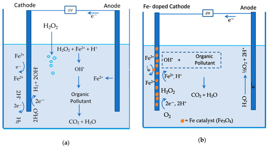 In more recent years, heterogeneous E-Fenton has emerged as a solution to the issues with iron hydroxide precipitation [8,9,10]. In this case, iron catalysts are incorporated as solids, usually oxides, such as Fe3O4, into a suitable electrode material. In Figure 1, a schematic is provided, illustrating homogenous and heterogeneous E-Fenton. As shown in Figure 1a for homogeneous E-Fenton, Fe2+ is generated from a sacrificial anode and reacts with the H2O2 in the bulk solution. An iron salt can also be added to the cell to facilitate this reaction. In contrast, the aim in heterogeneous E-Fenton (Figure 1b) is to maintain the Fe2+/Fe3+ couple in the solid state [11] and, provided the cathode promotes the two-electron reduction reaction to give H2O2, these coupled reactions can be sustained.