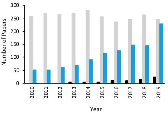 Number of publications shown as a function of the year of publication, taken from Scopus, for Fenton (grey), E-Fenton (blue) and E-Fenton coupled with graphene-based materials (black).