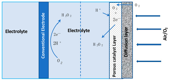 Gas diffusion electrodes (GDE) are being used increasingly in fuel cells [91], batteries [92,93] and in the generation of H2O2 [94,95]. They are attractive in E-Fenton, as the solubility of dissolved oxygen is very low in water and, by using these GDE electrodes, the oxygen in air could be employed instead. The GDE electrode consists of a gas diffusion layer and the solid catalyst in contact with the aqueous phase, consisting of solid, liquid and gaseous phases. Normally, the catalyst layer is porous and the aerogels described in Section 2.2.1 are finding applications as catalyst layers, facilitating interactions between the liquid and gas phase. A schematic diagram illustrating the difference between the oxygen reduction reaction at a conventional cathode and at a gas diffusion electrode is presented in Figure 4. As illustrated in this schematic, the air or gaseous phase is in contact with one side of the catalyst, enabling the diffusion of oxygen through the micropores of the diffusion layer to the catalyst phase, where it reacts with H+ from the aqueous phase, while the conducting catalyst provides the electron, facilitating the formation of H2O2. Recently, this approach is finding applications in E-Fenton [96,97,98]. However, in many of these reports, pure oxygen is pumped to the surface of the gas diffusion cathode, rather than having the typical gas/air, solid and liquid phases, as illustrated in Figure 4.