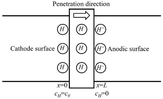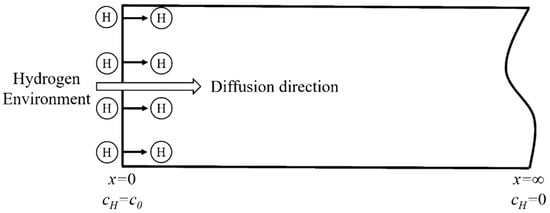 Applying the constant cathodic current in the electrochemical galvanostatic hydrogen charging provides a constant hydrogen concentration on the hydrogen charging surface of the specimen for the hydrogen diffusion into the steel. When adopting the semi-infinite diffusion model, it is assumed that the model is infinite in length (as shown in Figure 3). The diffusion equation conforms the second Fick’s law and the boundary conditions are: