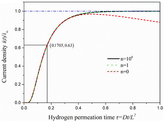 where is the permeation current at instant time t, is the steady state value of the hydrogen permeation current, is the hydrogen permeation flux on the anode surface at time t and is the hydrogen permeation flux under the steady state. The dimensionless time τ is equal to Dt/L2. To describe the change of current density in the process of hydrogen penetration visually, Matlab was used to write the program to draw hydrogen permeation current density curves under n = 0, 1 and 106, as is shown in Figure 6.