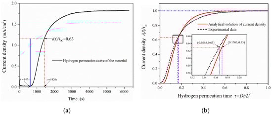 where is the lag time (the time from the start of hydrogen charging to i(t)/i∞ = 0.63) in the electrochemical hydrogen permeation test process. The hydrogen permeation curve of 2.25Cr-1Mo-0.25V steel was measured by EPT (as shown in Figure 7a). It shows that the time to start hydrogen charging is 617 s (hydrogen permeation time τ = 0 at this time), and the lag time in the process of hydrogen permeation test is 803 s (tL = 1420 s − 617 s). The experimental data were compared with the analytical solutions of oxidation current density obtained under the hydrogen permeation model, as is shown in Figure 7b. It can be seen that when the anode oxidation current density reaches i(t)/i∞ = 0.63, the permeation time under the hydrogen permeation model is τ = 0.1705. While the hydrogen permeation time in the experimental data is τ = 0.1658, it is almost consistent with the calculated value (τ = 1/6) taken in EPT and verifies the validity and accuracy of the test results.